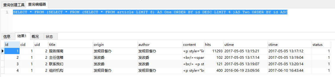 SELECT * FROM (SELECT * FROM (SELECT * FROM article LIMIT 8) AS One ORDER BY id DESC LIMIT 4 ) AS Two ORDER BY id ASC