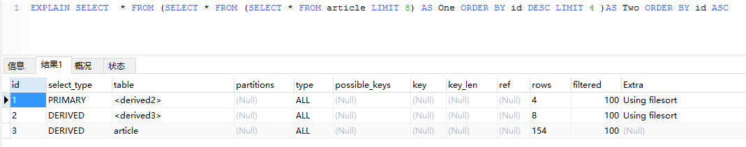 EXPLAIN SELECT * FROM (SELECT * FROM (SELECT * FROM article LIMIT 8) AS One ORDER BY id DESC LIMIT 4 )AS Two ORDER BY id ASC